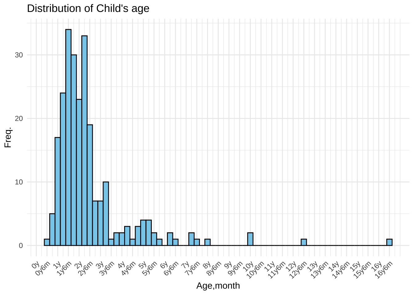 1歳から3歳までに多くのお子さんの年齢が集中していました。一番多い年齢群は1歳6ヶ月でした。