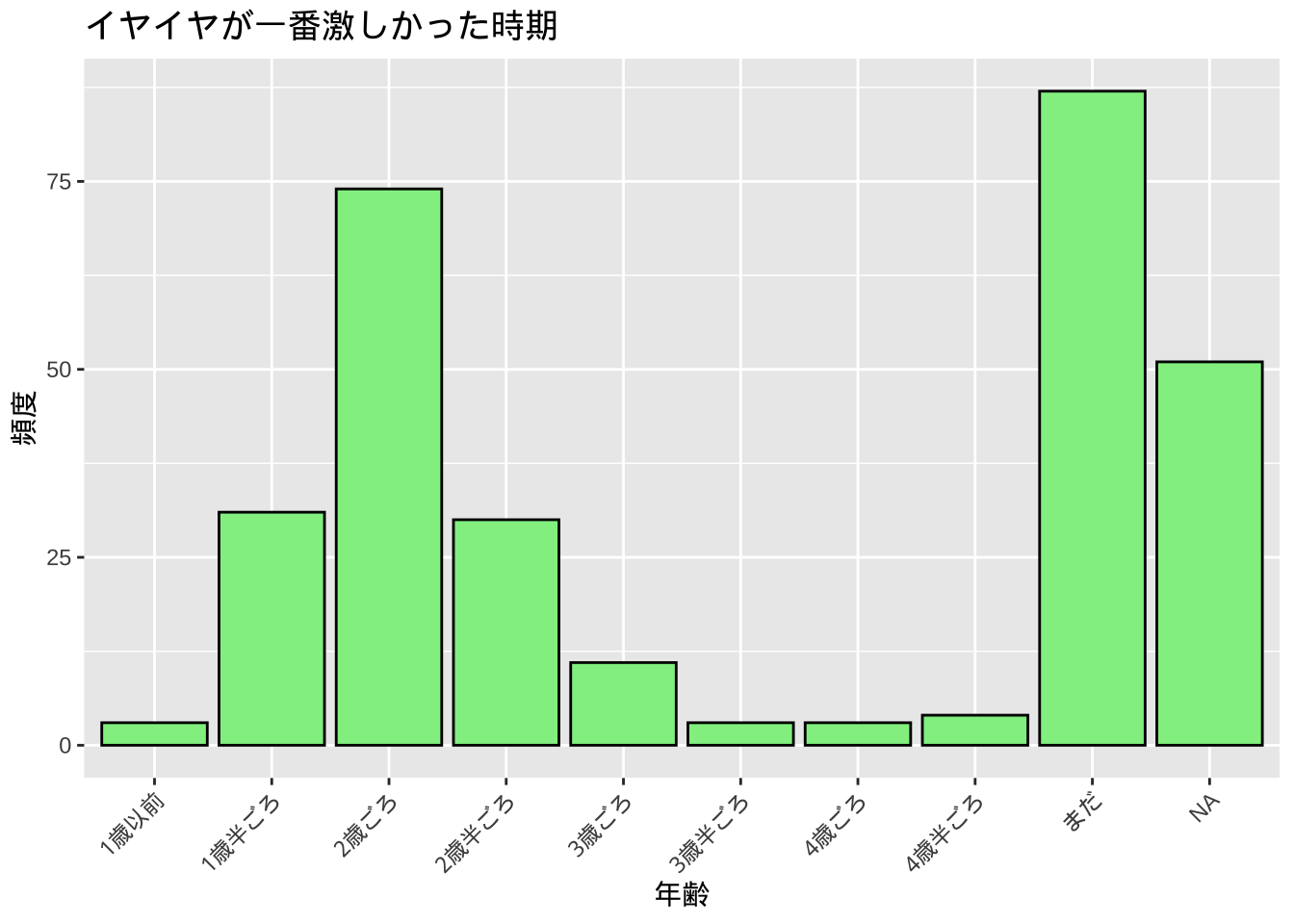 このことは、保護者にイヤイヤが激しかった時期はいつですか?と聞いた時に、2歳と答えた数が最も多く、1歳半と2歳半を含めるとほぼ全ての回答が含まれることからも確認できます(右端の「まだ」はイヤイヤ期をまだ迎えていないお子さんの数、NAは無回答を示します)。